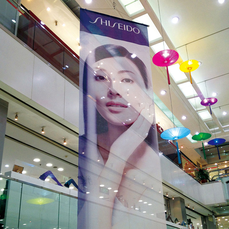 應用:商場中庭懸掛廣告,樓體防風廣告,裝飾藝術窗簾。