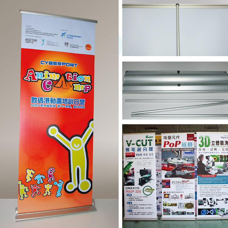旗、刀旗、易拉寶、拉網展架、彩易展系統、快幕秀、促銷臺、L形展架、人像立牌、海報架等。