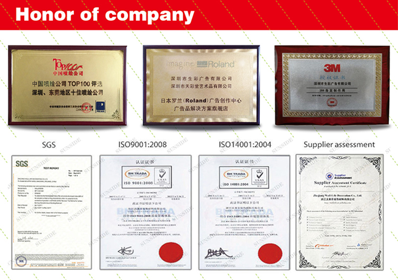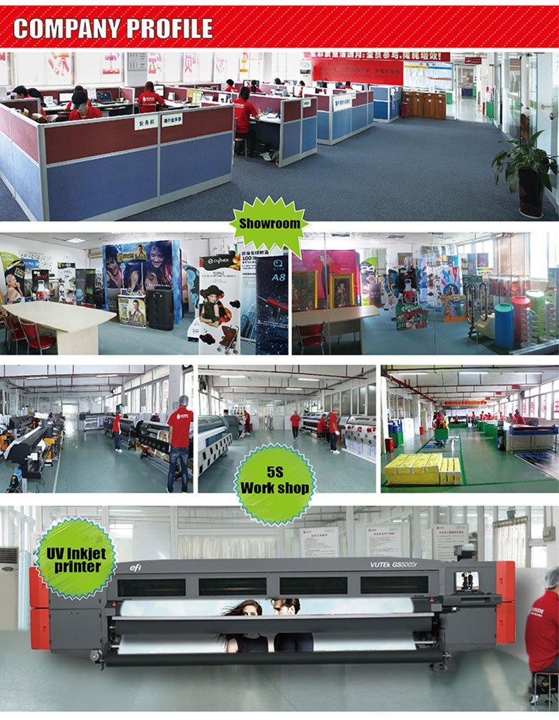 Production equipment: We have 36 sets inkjet printer of Japan Roland, 12 sets large format printer of Japan Seiko, 8 sets original import high precision inkjet printing EPSON machines, 3 sets America EFI VUTEK UV Machines,2 sets OCE Flat Plate UV Printing machines, 5 sets Roland heat transfer digital printing machine,12 sets Automatic processing equipment .