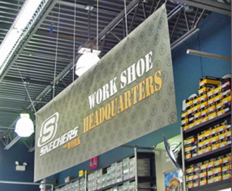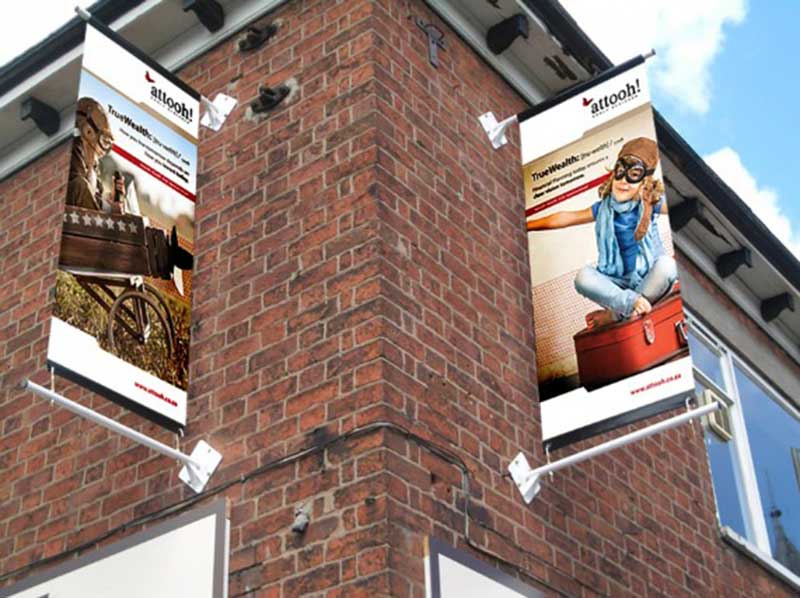 The double sided Hanging Banners can be manufactured according to your required specifications and can be ordered in bulk. The vertical hanging banner in the image has a pocket at the top with two eyelets at the bottom and printed on PVC. We also have hanging banners that comes supplied with an aluminum system. All hanging banners are printed in full color on cloth or PVC and can be manufactured as single sided or double sided units.