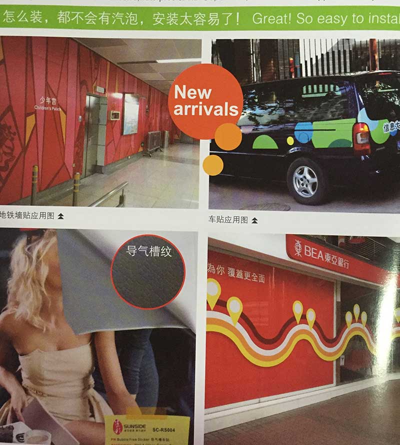 廣告噴繪,燈片噴繪,燈布噴繪,貼紙噴繪,廣告解決方案 導氣槽不干膠,面材成分是PVC,粘性強,膠面有紋路,可以排出安裝時產(chǎn)生的氣體,不留殘膠。 應用:適用于墻面,玻璃,車身貼,標簽等廣告。 特性:可移,防水防曬,無氣泡,戶內(nèi)戶外應用,易安裝。
